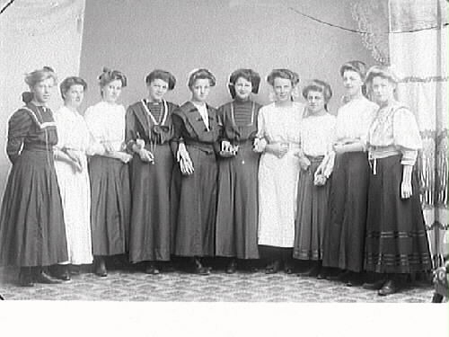Tio unga kvinnor står arm i arm. (Se även bildnr MR2_1044)
