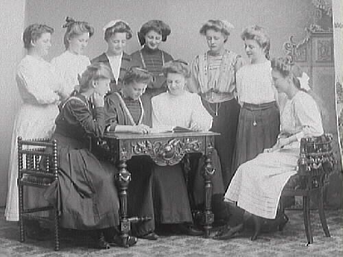 Tio unga kvinnor arrangerade i en scen där tre av dem sitter och läser vid ett bord (Se även bildnr MR2_1038)
