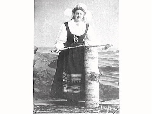 Kvinna i folkdräkt med en träpinne vid björkstubbe mot havsfond.
