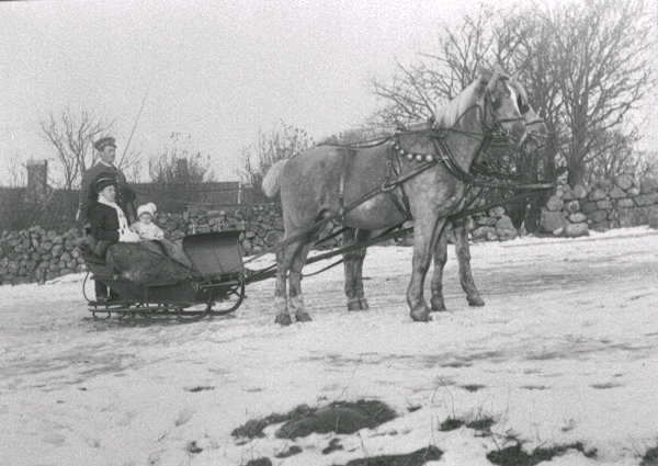 Snöbild av ett hästekipage där kvinna och barn sitter under en fäll i släden och kusken står bakom dem. Hästarna har bjällror. Möjligen är bilden tagen på Kungsgatan i Varberg (se bildnr MR2_1037)