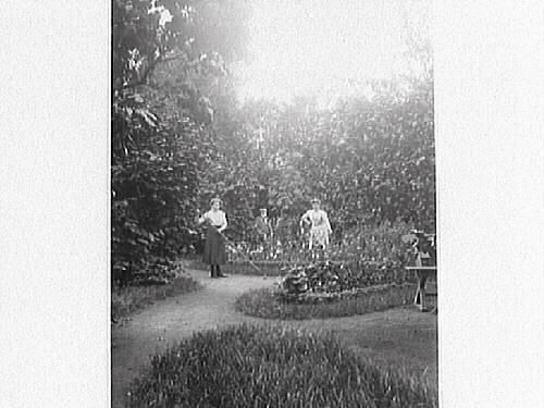 Två stående kvinnor och en sittande man i en prydlig trädgård med anlagda grusgångar, rabatter och höga buskage. Kvinnan till vänster krattar gången. (Se även bildnr MR2_1026, troligen samma trädgård)