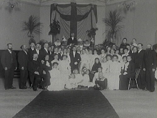 Bröllop, troligen i en frikyrka. Brudpar med bröllopsgäster. (Se även bildnr MR2_1096, MR2_1100)