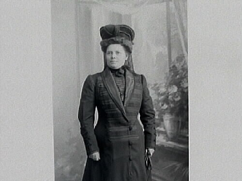 Kvinnoporträtt. Mörkt klädd kvinna i kappa och hög hatt, möjligen sorgekläder.