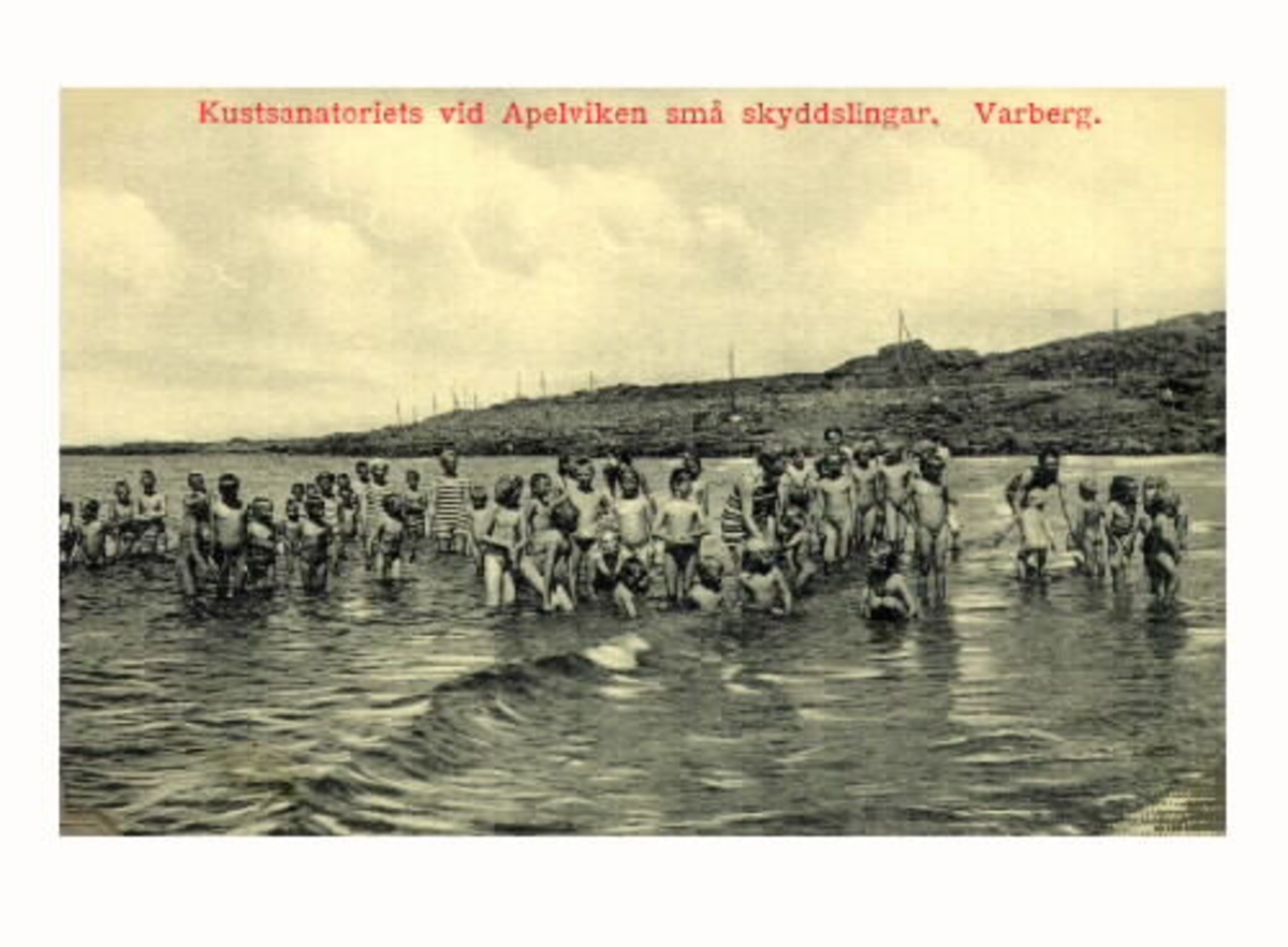 Vykort, "Kustsanatoriets vid Apelviken små skyddslingar. Varberg." Patienter och sköterskor badar vid Lilla Apelviken. Sol och bad ingick i behandlingen av tbc-patienterna vid sanatoriet.