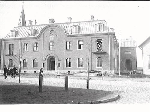 Uppförandet av Tingshuset i Falkenberg. Årstad och Faurås häradsrätt. Arkitekt var Fredrik Dahlberg från Stockholm. Kv Kyrkan 2, Nygatan 41. I bakgrunden syns kyrktornet. (Se även bild MR2_803)
