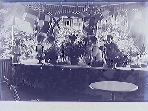 Veranda i park/trädgård med ett långt bord med blombuketter i förgrunden och folk i bakgrunden. Ett flaggspel hänger i taket. Troligen från en utställning i societetsparken.