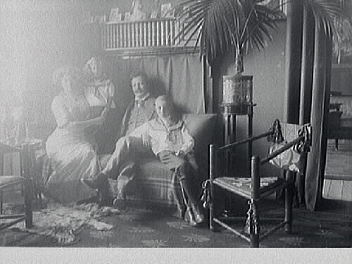 Interiörbild av familjen Hellborg som sitter på en soffa; makar med två barn. Intill står en tidstypisk "munkstol" och palm på peidestal.