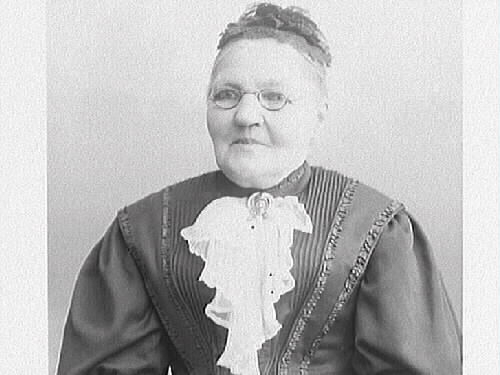 Ateljéfoto av äldre kvinna i glasögon och vitt krås på mörk klänning.