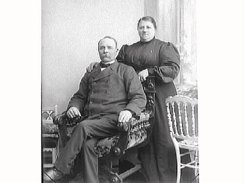 Parporträtt där den mustaschprydde mannen sitter och kvinnan står bakom honom.