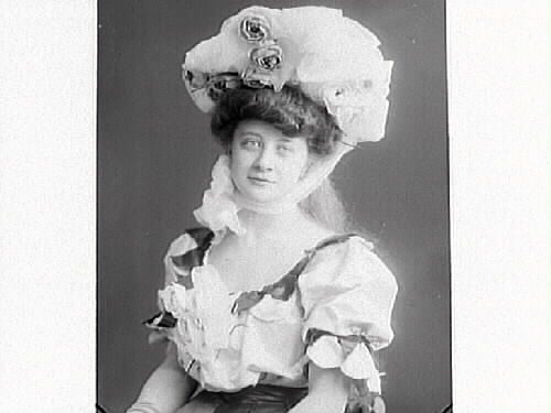 Ateljéporträtt av en ung kvinna i en oerhört stor hatt fäst med band under hakan och en matchande kortärmad klänning med puffärmar och decolletage. Kanske en aktris av något slag? (Se även bilderna MR2_931, 950, 969, 975)