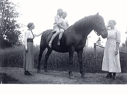 Två barn rider barbacka på en häst. Bredvid står två kvinnor, varav någon eller båda förmodligen heter Alm. Haby i Örby, Marks kn. (Se även bild MR2_1427)