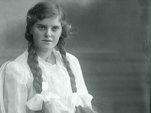 Ateljéporträtt av flicka med långa flätor.