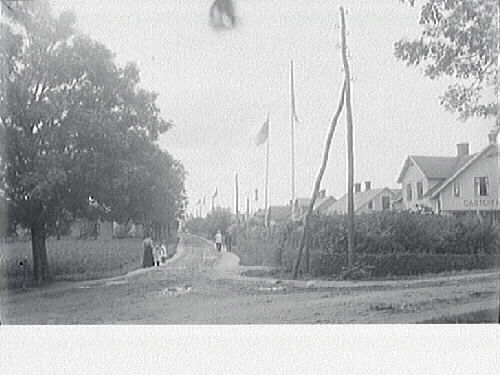 Under det stora trädet till vänster skymtar man den ateljé som Mathilda uppförde i Slöinge (nuvarande Konsum), Stationsgatan. Till höger ligger gästgivaregården och till en början hade Ranch sin ateljé i något av husen bakom den. Notera i förgrunden också den höga elstolpen tillverkad av naturliga trädstammar. Vägen som går vidare åt höger är gamla E6:an.