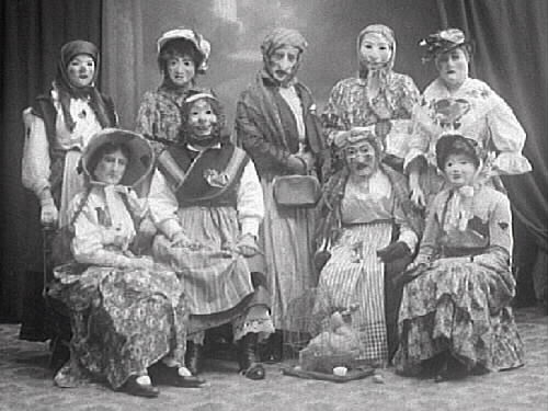 En grupp (flickor) med ansiktsmasker, utklädda till påskkärringar. Framför påskärringarna står en bur med en höna och ett ägg.