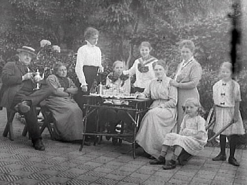 Kaffedrickande i Mathilda Ranchs trädgård i kv Bagaren, Prästgatan. Från vänster: Elof Ernwald, okänd, Hulda Lindh, Anna-Greta Alling?, Ingrid Alling, Nathalia Alling?, Mathilda Ranch, Anna-Stina Alling och en okänd flicka. (Något skadad bild)