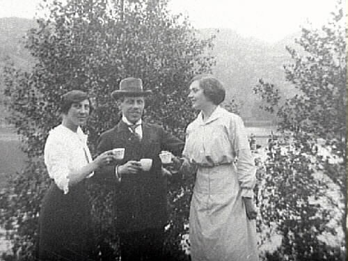 En man omgiven av två kvinnor står med varsin kaffekopp vid en sjö.
