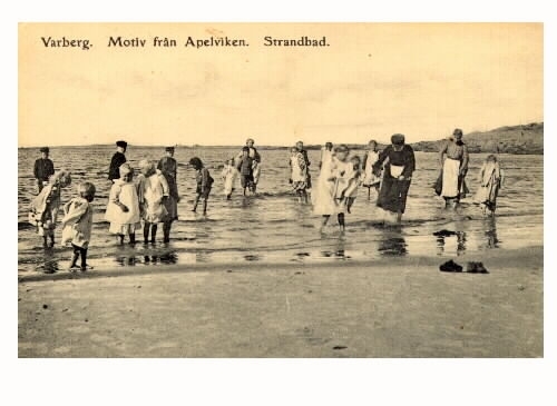 Vykort, "Varberg. Motiv från Apelviken." Patienter och personal vid den första paviljongen på Kustsanatoriet Apelviken, byggd 1904.