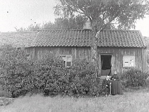 Ett äldre par framför sin stuga. Dörren står öppen och framför huset växter det buskar samt en björk.