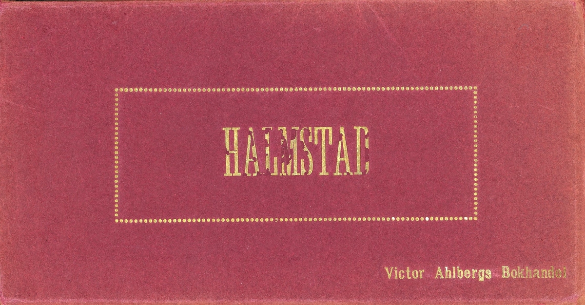 Häfte med 10 fotografier från Halmstad i ett ark vikt likt "dragspel" och utgivet av Victor Ahlbergs Bokhandel.