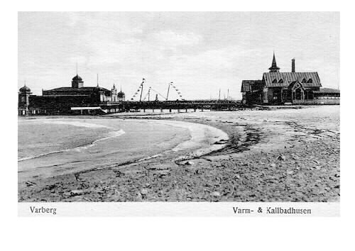 Vykort, "Varberg. Kall- och varmbadhusen." Varmbadhuset ligger till höger på land och kallbadhuset till höger. I förgrunden syns B