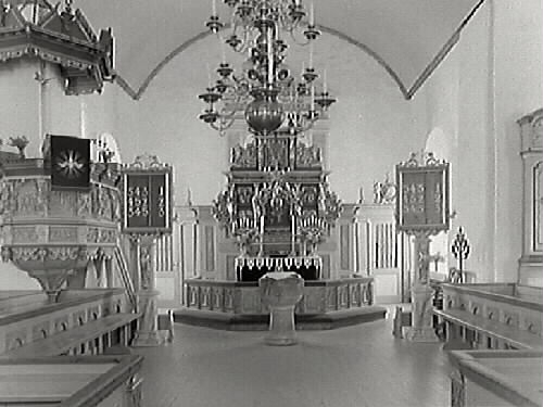 Interiörbild från Rolfstorps kyrka av koret med korbänkar på sidorna och sakristian bakom skranket. Altare, altarring, dopfunt, predikstol.