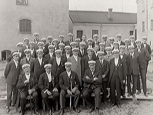 Varbergs Musiksällskap, sångherrar samlade på borggården till Varbergs fästning. Alla bär studentmössor.