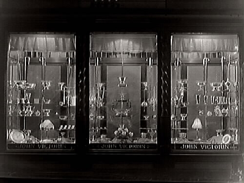 Skyltfönster kvällstid för John Viktorins guldsmedsaffär, som låg vid hörnet Kungsgatan-Norrgatan, kvarteret Berget, Varberg.