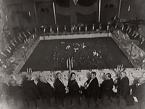 Middagsgäster sitter kring ett i kvadrat dukat bord, Furirskolan K3, Skövde. Taget ovanifrån, läktare e dyl.