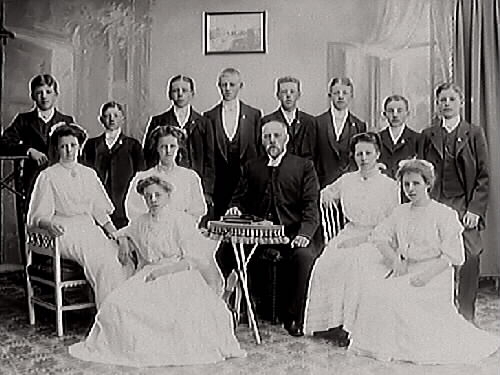 Konfirmationsgrupp med prästen i mitten omgiven av flickor i vida vita klänningar med puffärmar och gossarna uppställda baktill i kostym.
