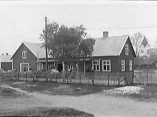 "Lantmannaaffären" i Tvååker bakom ett staket. I bakgrunden syns ett kyrktorn till höger.