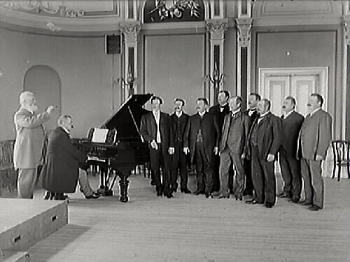 Mustaschprydda herrar sjunger under ledning av en dirigent, ackompanjerade på flygel.