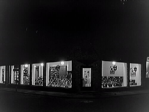 Skyltfönster kvällstid. Monarks cykelbutik som låg i hörnet Kyrkogatan-Drottninggatan. Bilden tagen mot nordväst.