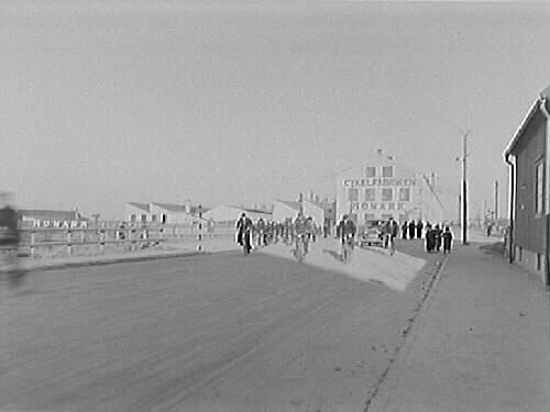 Arbetare på väg hem till fots eller på cykel från arbetet på cykelfabriken Monark i Varberg.