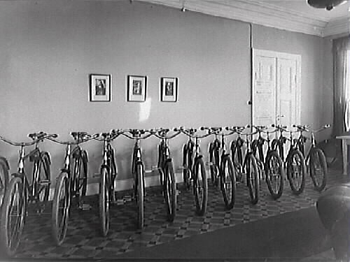 Cyklar från Monark uppställda prydligt längs en vägg inne i ett möblerat rum.