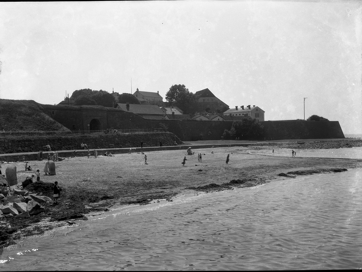 Vy från Kallbadhuset mot Varbergs fästning och Barnens badstrand i förgrunden. Till vänster ses ett några badhytter och barn leker på stranden.