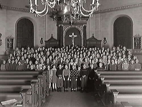 Barnkörerna i Varbergs kyrka framträder. Ett stor barnaskara är samlad framma i koret.
