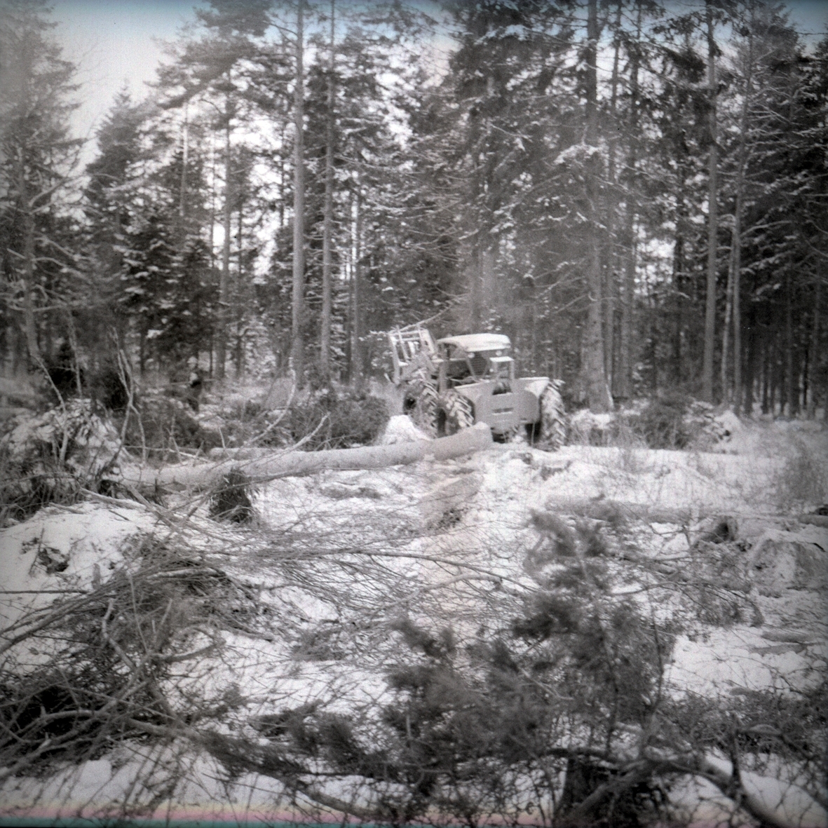 Titel: Skogsavverkning i Böda. Skogsmaskinen "Timber Jack" provkörs.
