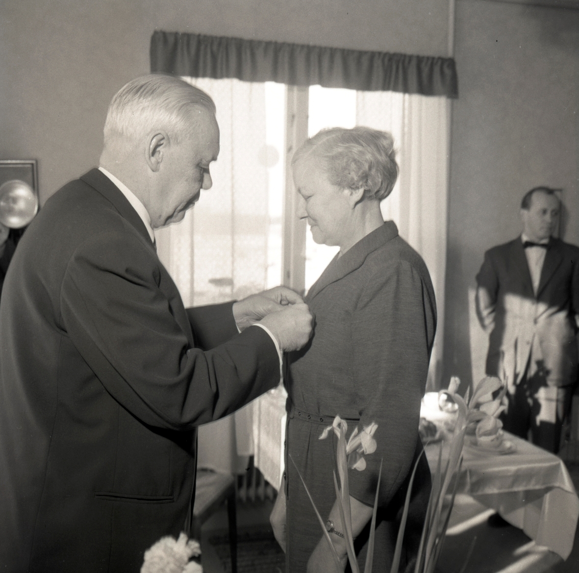 Medaljöverlämning och middag i Föra 10/2 1960. Postdirektör Axel Engers, Fru Berta Nilsson, Föra. Postmästaren Cir Ewers, Borgholm.