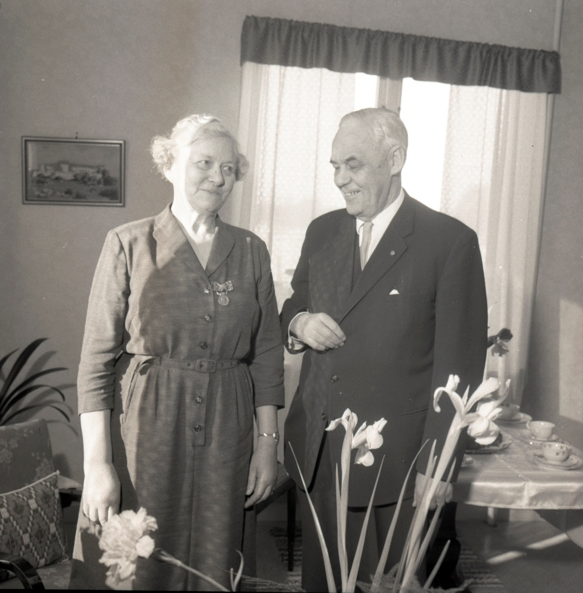 Titel: Medaljöverlämning och middag i Föra 10/2 1960. Postdirektör Axel Engers, Fru Berta Nilsson, Föra. Postmästaren Cir Ewers, Borgholm.