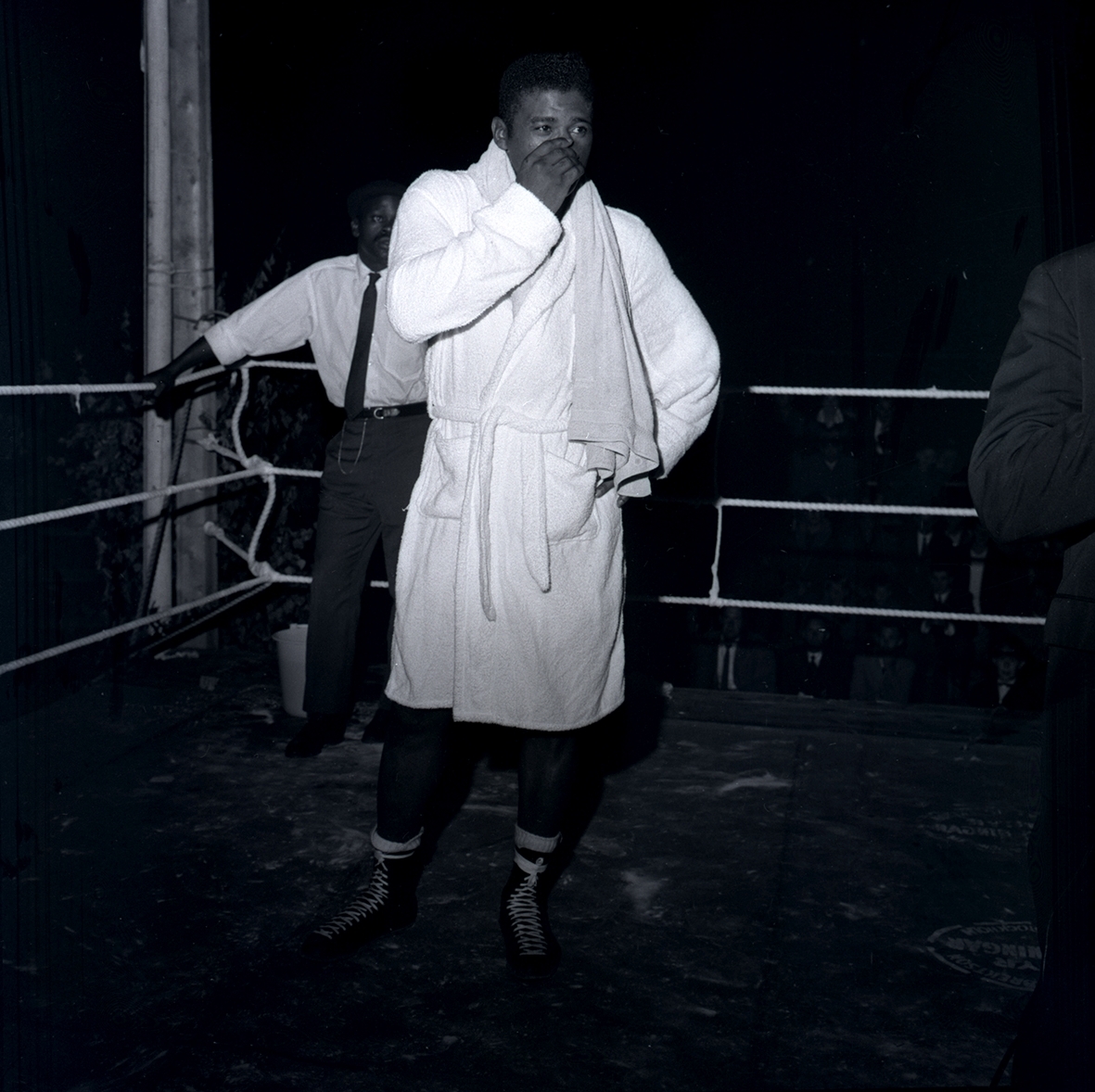 Floyd Pattersson i ringen, torkar sig med handduk. Pattersson, som mött svensken Ingemar Johansson flera gånger, var mycket populär i Sverige och gjorde flera uppvisningsturnéer.