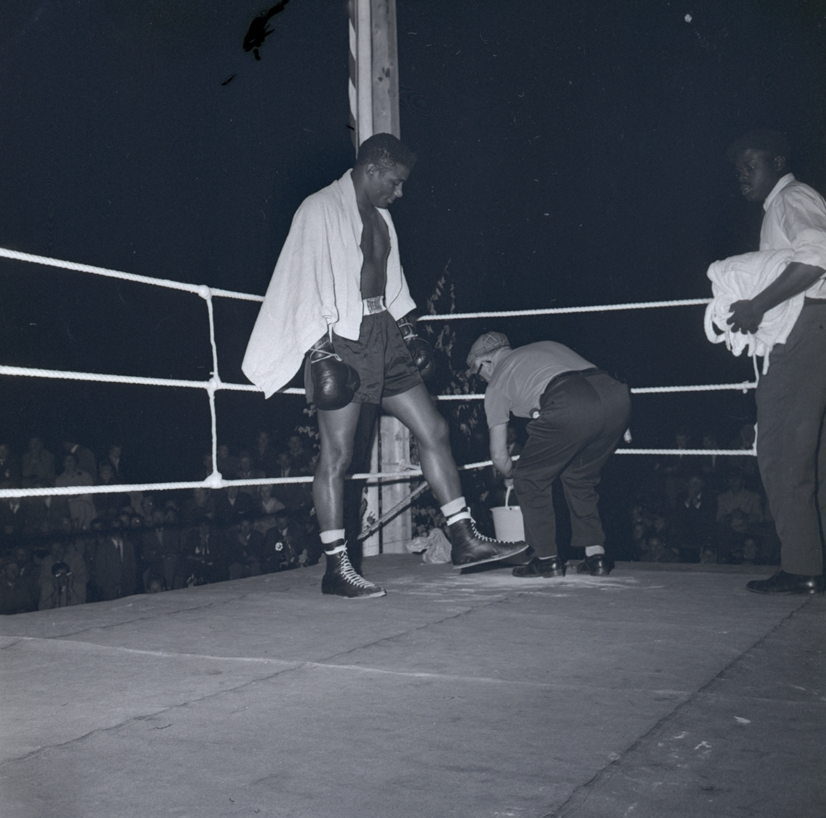 Floyd Pattersson och två andra män i ringen. Pattersson, som mött svensken Ingemar Johansson flera gånger, var mycket populär i Sverige och gjorde flera uppvisningsturnéer.
