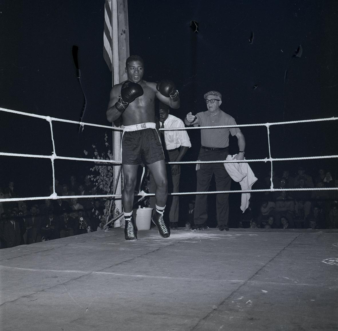 Floyd Pattersson i ringen, redo i ett hörn. Pattersson, som mött svensken Ingemar Johansson flera gånger, var mycket populär i Sverige och gjorde flera uppvisningsturnéer.