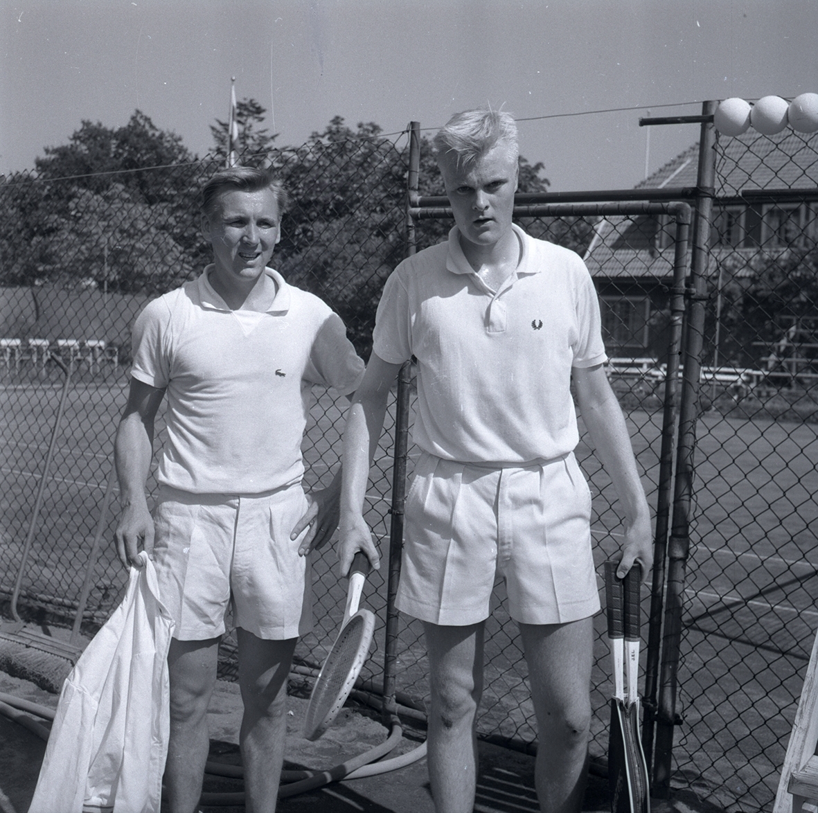 Två personer vid tennisbanan 1958. J E Lundkvist till höger och Bengt Axelsson.