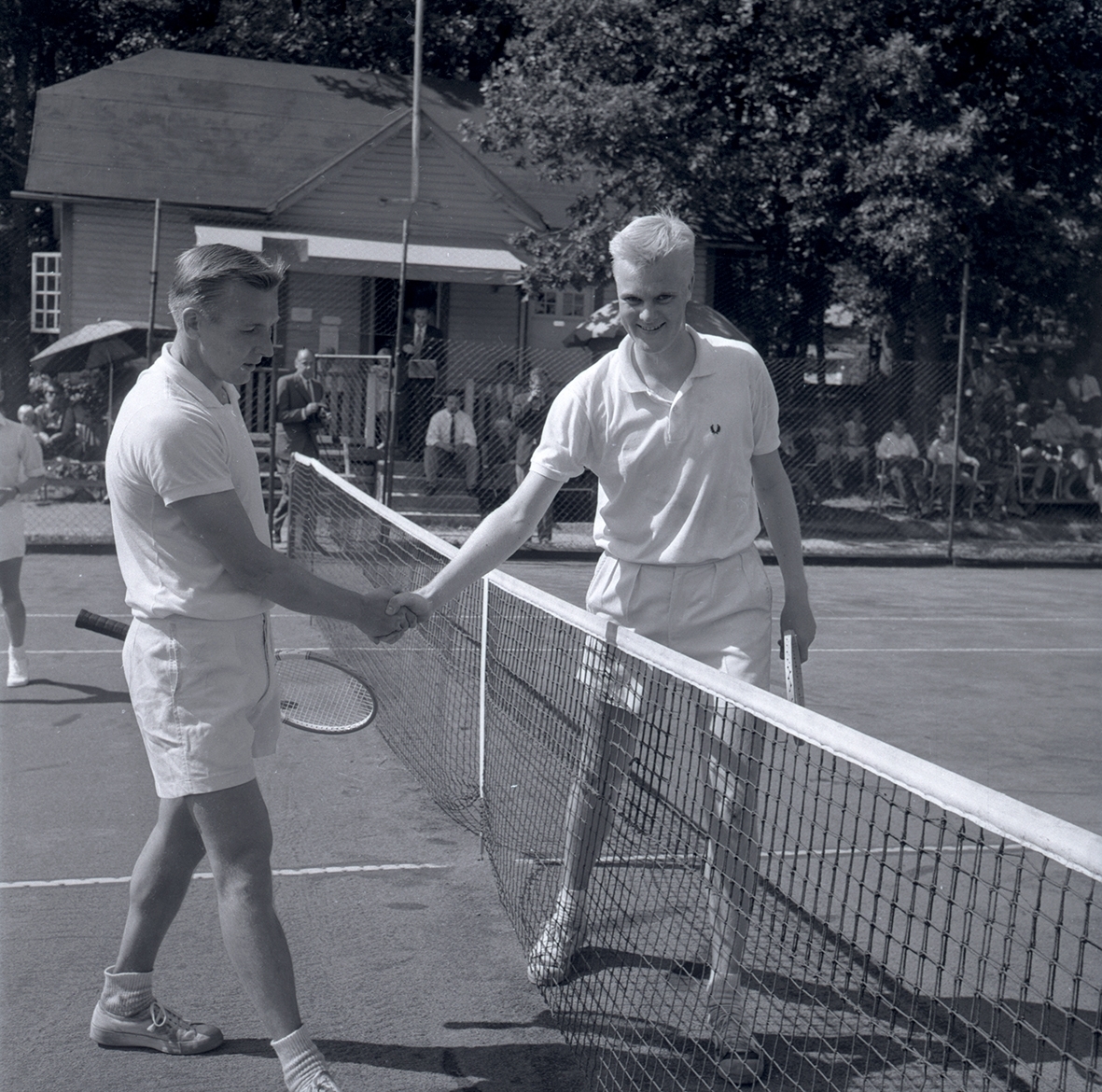 Fyra personer vid tennisbanan 1958. Skakar hand. Namn som medföljde bild: J E Lundkvist (t.h.) och Bengt Axelsson.