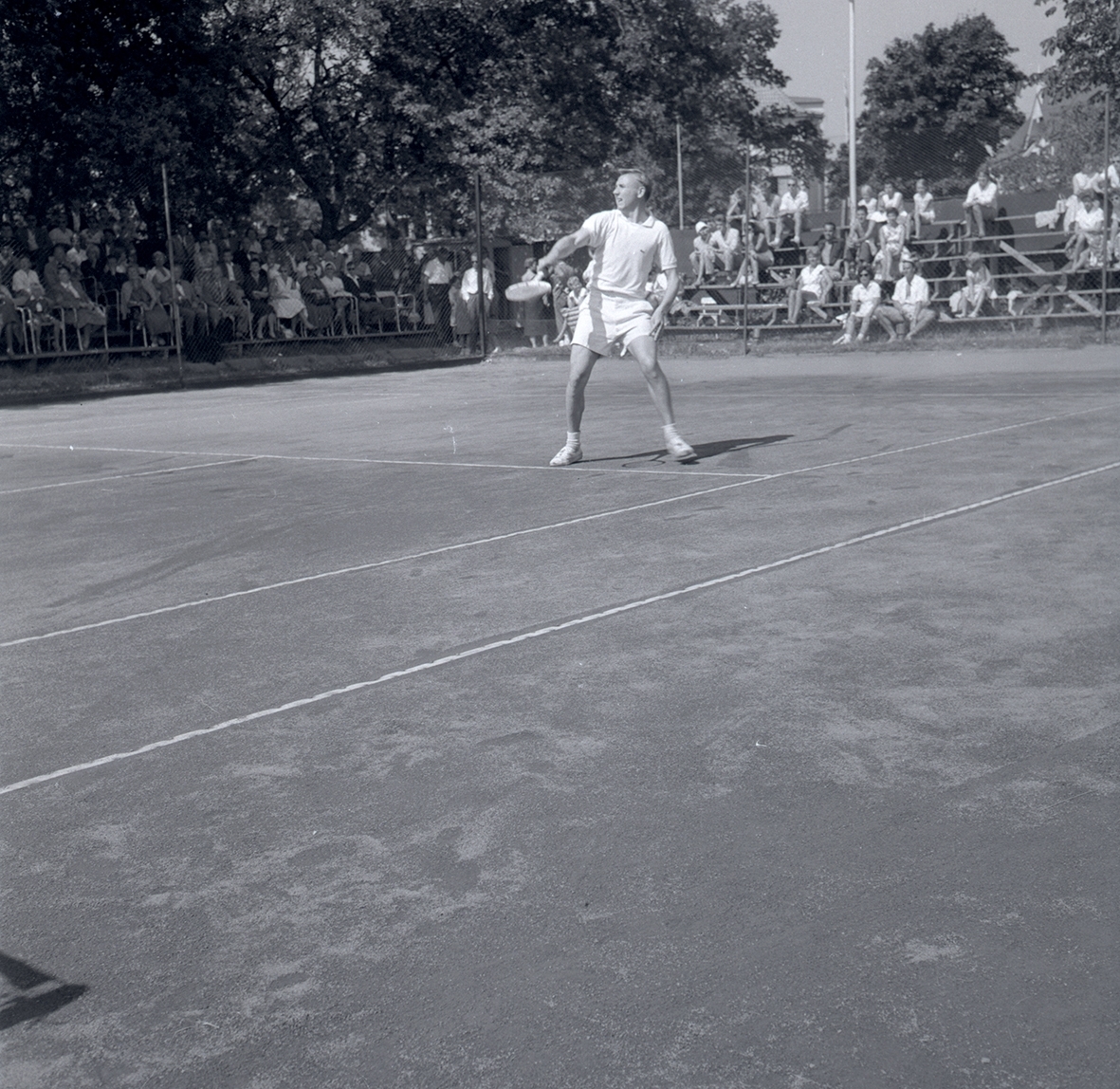 En tennisspelare, förmodligen i en match. 1958. Namn som medföljde bild: J E Lundkvist och Bengt Axelsson.