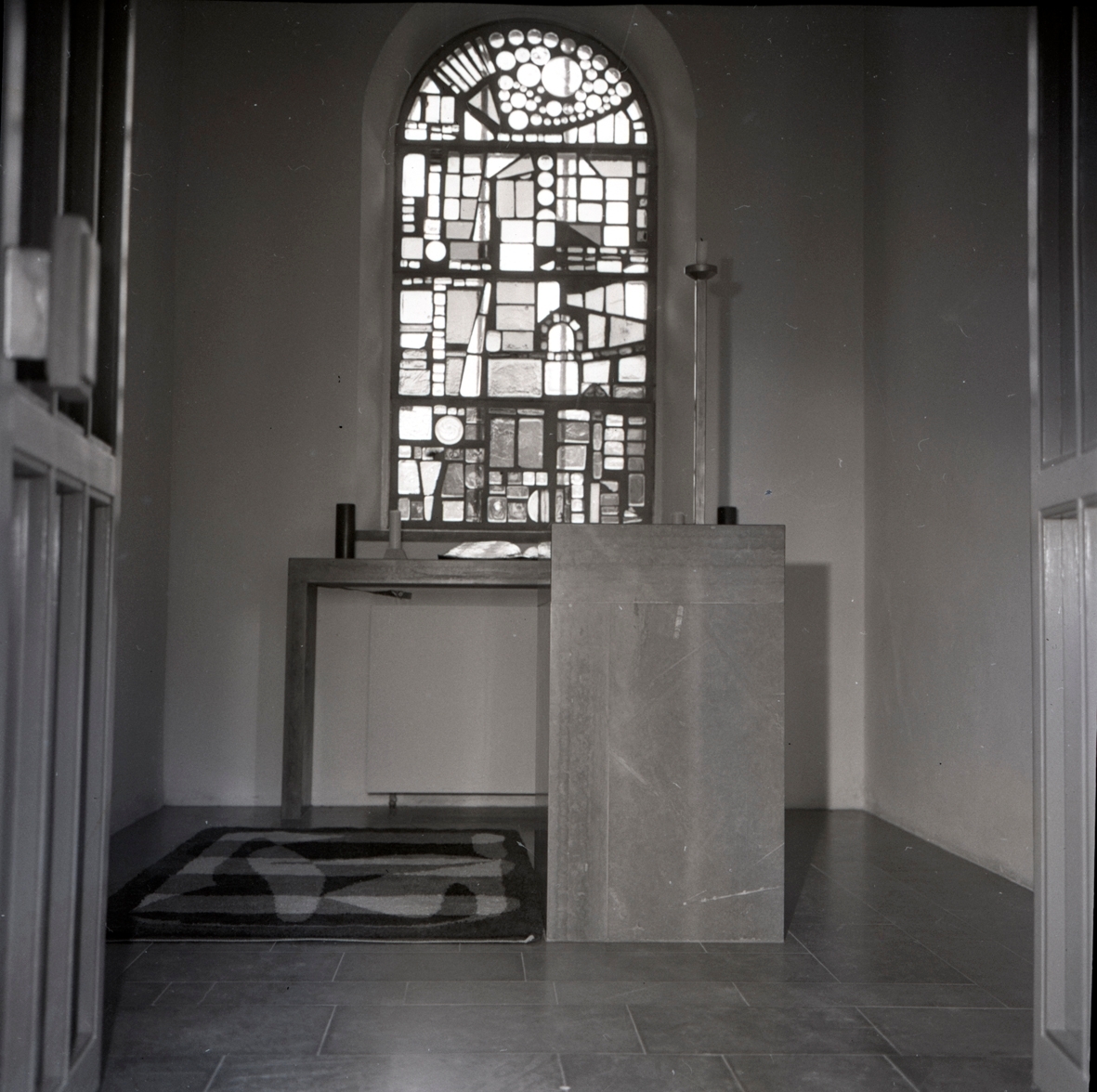 Alböke kyrka under renovering. Infattat fönster.
