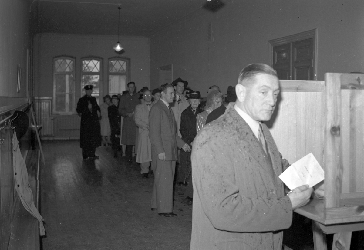 Från valdagen. Den 15 september 1946. Man vid röstskärm