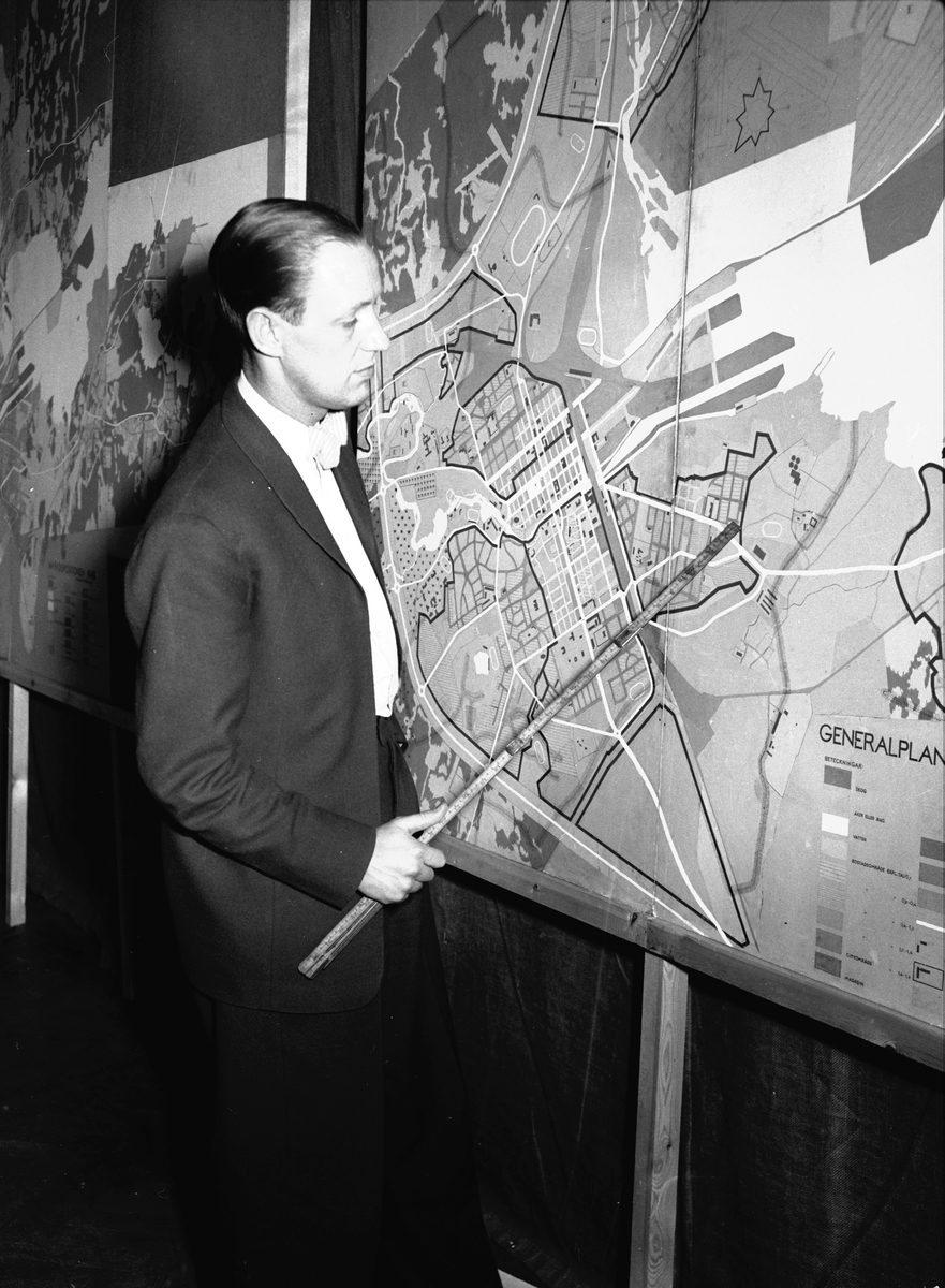 Arkitekt Per Olof Lefvert förevisar generalplanen. Stadsplaneutställningen den 13 mars 1950.