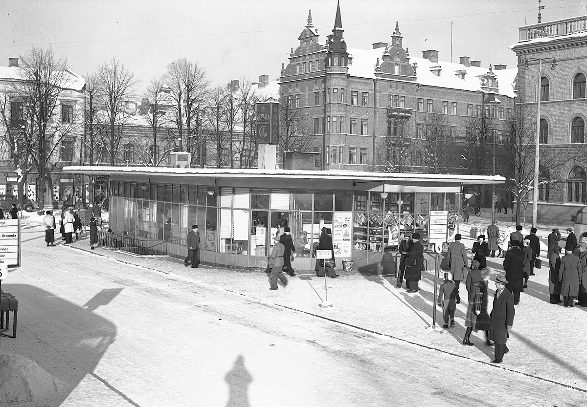 Busstation på stortorget med Gevaliaskylt på taket. den 9 februari 1947