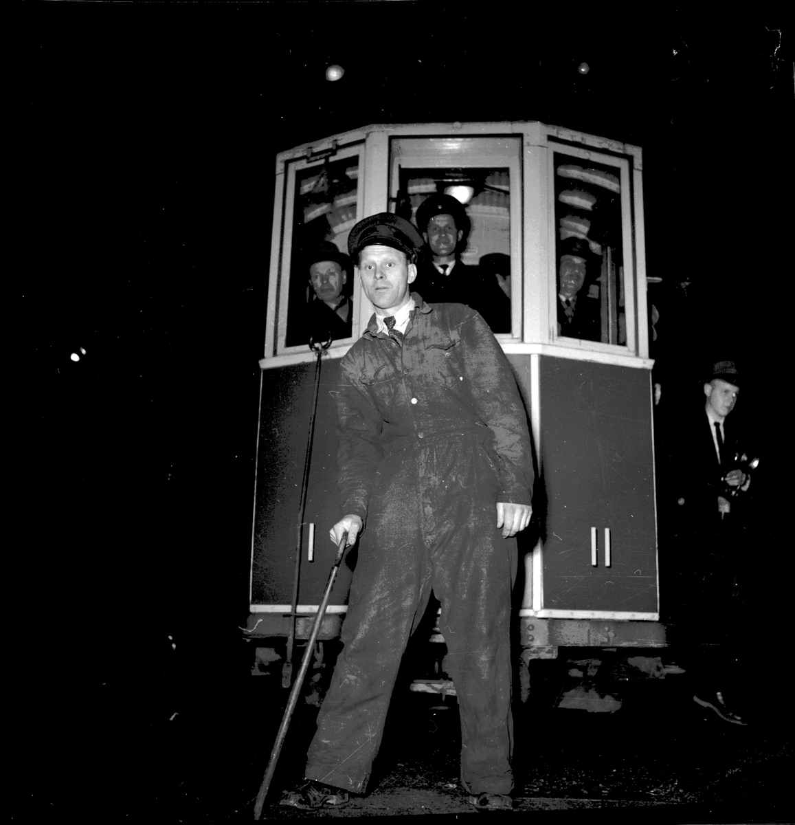 Spårvagnarnas sista tur. Avskedsfest vid lokstallarna. 19 oktober 1952. Walfrid Edling på förarplatsen, Isidor Fortsberg till vänster.